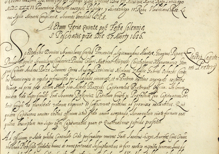 Z księgi radzieckiej obejmującej lata 1630–1637 fragment strony 1431 z wpisem dokonanego w 1636 roku za kadencji burmistrzowskiej Stanisława Konradta – oraz powiększenie zapisu imienia i funkcji burmistrza (Archiwum Państwowe w Krakowie, sygn. rkps 460, s. 1431)