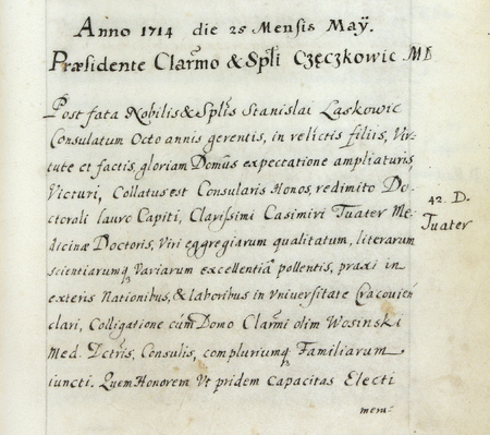 Z urzędowego spisu rajców obejmującego lata 1363–1802 fragment strony 47 z wpisem z 1714 roku o wyborze do rady po zmarłym rajcy Stanisławie Laskiewiczu nowego rajcy Kazimierza Franciszka Tuatera (nr 588) – oraz powiększenie zapisu imienia (Archiwum Państwowe w Krakowie, sygn. rkps 1477, s. 47)