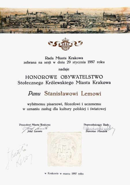 Z uroczystości wręczenia dyplomu honorowego obywatelstwa 22 marca 1997 r. w Pałacu Wielopolskich. Stanisław Lem w sali Obrad RMK oraz własnoręczny podpis uhonorowanego.