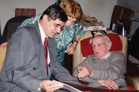 Dyplom honorowego obywatelstwa (egzemplarz z Muzeum Krakowa z widocznym przekreśleniem – zdeponowany w muzeum dyplom odbiega od ostatecznego kształtu, w którym zgodnie z uchwałą RMK winna być formuła: w uznaniu zasług dla sprawy niepodległości Polski oraz podpis także prezydenta miasta); po prawej stronie fotografia z przełomu maja i czerwca 1993 r. ze spotkania przedstawiciela miasta Kazimierza Trafasa w edynburskim mieszkaniu uhonorowanego – przekazanie dyplomu honorowego obywatelstwa Krakowa.