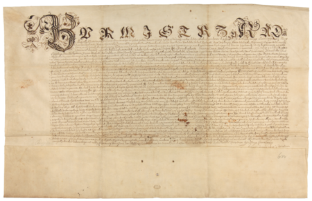 Dokument wystawiony w 1614 roku w Kazimierzu przez burmistrza i radę miasta Kazimierza, mocą którego zatwierdzili oni statut bractwa cechowego szyprów kazimierskich według projektu przedstawionego przez mieszczan trudniących się tą profesją, na czele których stał starszy bractwa, rajca Stanisław Ruskowicz – oraz zbliżenie zapisu imienia i urzędu (Archiwum Narodowe w Krakowie, sygn. perg. 726)