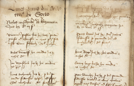 Z księgi przyjęć do prawa miejskiego obejmującej lata 1423–1493 fragmenty stron 212–213 z wpisem z 1466 roku zawierającym rekomendację Stanisława Steinbacha udzieloną Wincentemu Paselerowi przy przyjmowaniu go do prawa miejskiego – oraz powiększenie zapisu imienia (Archiwum Państwowe w Krakowie, sygn. rkps 1421, s. 212–213)