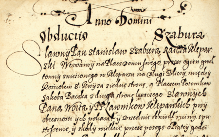 Z księgi ławniczej Kleparza obejmującej lata 1605–1615: początkowy fragment wpisu z 1615 roku dotyczącego wizji lokalnej na pogorzelisku domu rajcy Stanisława Szabury – oraz zbliżenie zapisu imienia i urzędu (Archiwum Narodowe w Krakowie, sygn. KL 6, s. 837v)