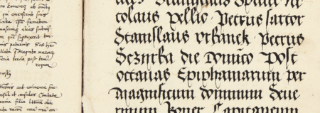 Z księgi radzieckiej Kazimierza obejmującej lata 1521–1533: fragment wpisu dokumentującego wybór rady urzędującej na rok 1524, ze Stanisławem Urbankiem w składzie – oraz zbliżenie zapisu imienia (Archiwum Narodowe w Krakowie, sygn. K 9, s. 39)