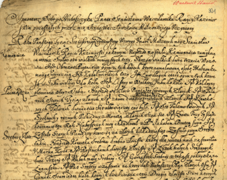 Z fascykułu zawierającego inwentarze rzeczy ruchomych i nieruchomych mieszczan kazimierskich z lat 1595–1791: początkowy fragment inwentarza pośmiertnego sporządzonego w 1642 roku przez Annę, wdowę po rajcy Stanisławie Wacławiku – oraz zbliżenie zapisu imienia i urzędu (Archiwum Narodowe w Krakowie, sygn. K 449, s. 301)