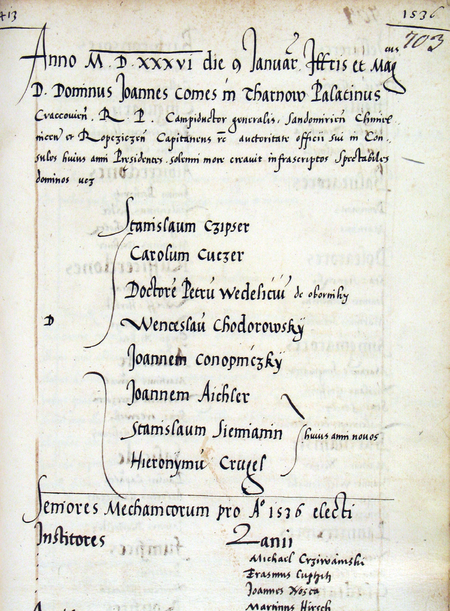 Z księgi radzieckiej obejmującej lata 1532–1536 fragment strony 703 z wpisem zawierającym wykaz rajców urzędujących wybranych na rok 1536, wśród których wymieniony został Stanisław Ziemianin – oraz powiększenie zapisu imienia (Archiwum Państwowe w Krakowie, sygn. rkps 435, s. 703)