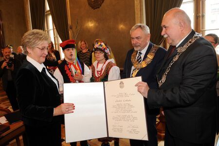 Akt wpisu laureatki do Księgi Medalu „Cracoviae Merenti”; prezentacja dyplomu w asyście prezydenta miasta i przewodniczącego RMK oraz podopiecznych Fundacji.