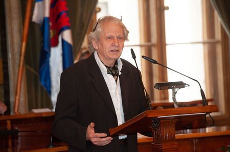Akt wpisu laureata do Księgi Medalu „Cracoviae Merenti” w asyście przewodniczącego RMK; laureat podczas wystąpienia w Sali Obrad RMK.