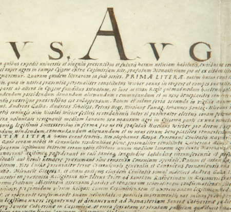 Fragment dokumentu wydanego w 1563 roku w Piotrkowie, w którym Zygmunt August potwierdził i powtórzył siedem wcześniejszych dokumentów dotyczących pól i łąk we wsi Czyżowa, w tym akt wydany w 1439 roku w Kazimierzu, mocą którego rajcowie kazimierscy, z ówczesnym burmistrzem Stefanem Rosą na czele, potwierdzili, że Katarzyna, wdowa po Wojciechu Czipce, wraz z córką Małgorzatą przekazały pół łanu we wsi Czyżowa cechowi piwowarów kazimierskich – oraz zbliżenie zapisu imienia i funkcji (Archiwum Narodowe w Krakowie, sygn. Aug. perg. 209)