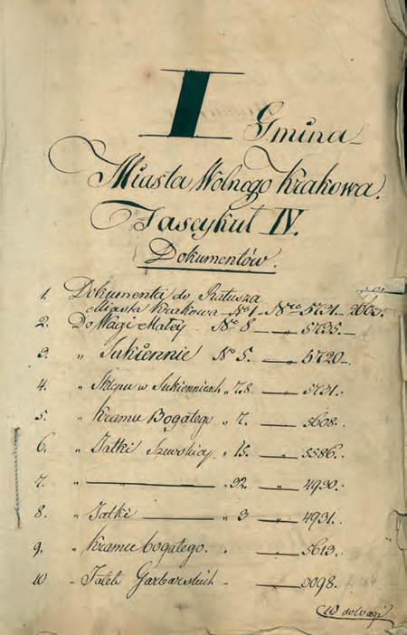 Z Księgi gruntowej Krakowa – vol. antiqua Gmina I strony ze sporządzonego w 1821 r. i podpisanego przez wójta Szymona Białeckiego Wykazu statystycznego wszelkich realności w Gminie I-wszy Miasta Wolnego Krakowa znaydujących się do ułożenia katastru hypotecznego służyć maiący (Archiwum Narodowe w Krakowie, sygn. rkps dok. dep. 224, nlb)