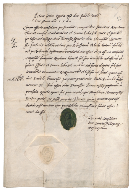 Dokument wystawiony w 1560 roku przez radę miejską Kleparza, w którym stwierdzono, że rajca i wójt kleparski Mikołaj Turek (nr 65) oraz Szymon Łabuzek, mieszczanin kleparski, w związku ze sprawą Sebastiana Palucha, opiekuna Agnieszki, wdowy po krawcu Stanisławie Żarnowskim, zaświadczyli, że syn-pogrobowiec tegoż Stanisława, zmarłego podczas epidemii dżumy, został ochrzczony i otrzymał po ojcu imię Stanisław; dokument opatrzony jest odciskiem w zielonym wosku pieczęci radzieckiej kleparskiej – oraz zbliżenie pieczęci rady miejskiej i zapisu imienia (Biblioteka Naukowa PAU/PAN w Krakowie, sygn. rkps 437, s. 53)