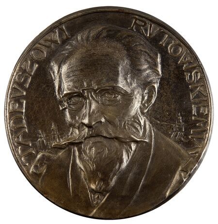 Reprodukcja wniosku o nadanie tytułu; niżej odlewana plakieta o średnicy 16 cm z portretem Tadeusza Rutowskiego z 1915 r. według projektu Jana Raszki oraz miejsce spoczynku – grobowiec na cmentarzu Łyczakowskim we Lwowie i zbliżenie napisu nagrobnego – tam błąd w oznaczeniu roku urodzenia.