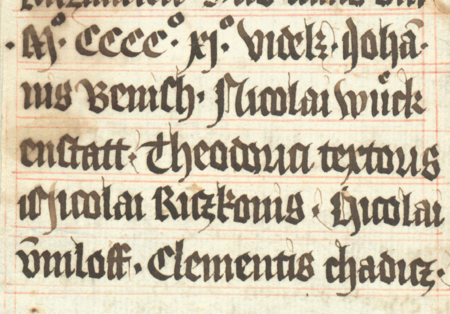 Z księgi radzieckiej Kazimierza obejmującej lata 1402–1416: fragment wpisu dokumentującego wybór rajców na rok 1411, z Teodorykiem sukiennikiem w składzie – oraz zbliżenie zapisu imienia (Biblioteka Jagiellońska, sygn. rkps 1045/1, k. 217)