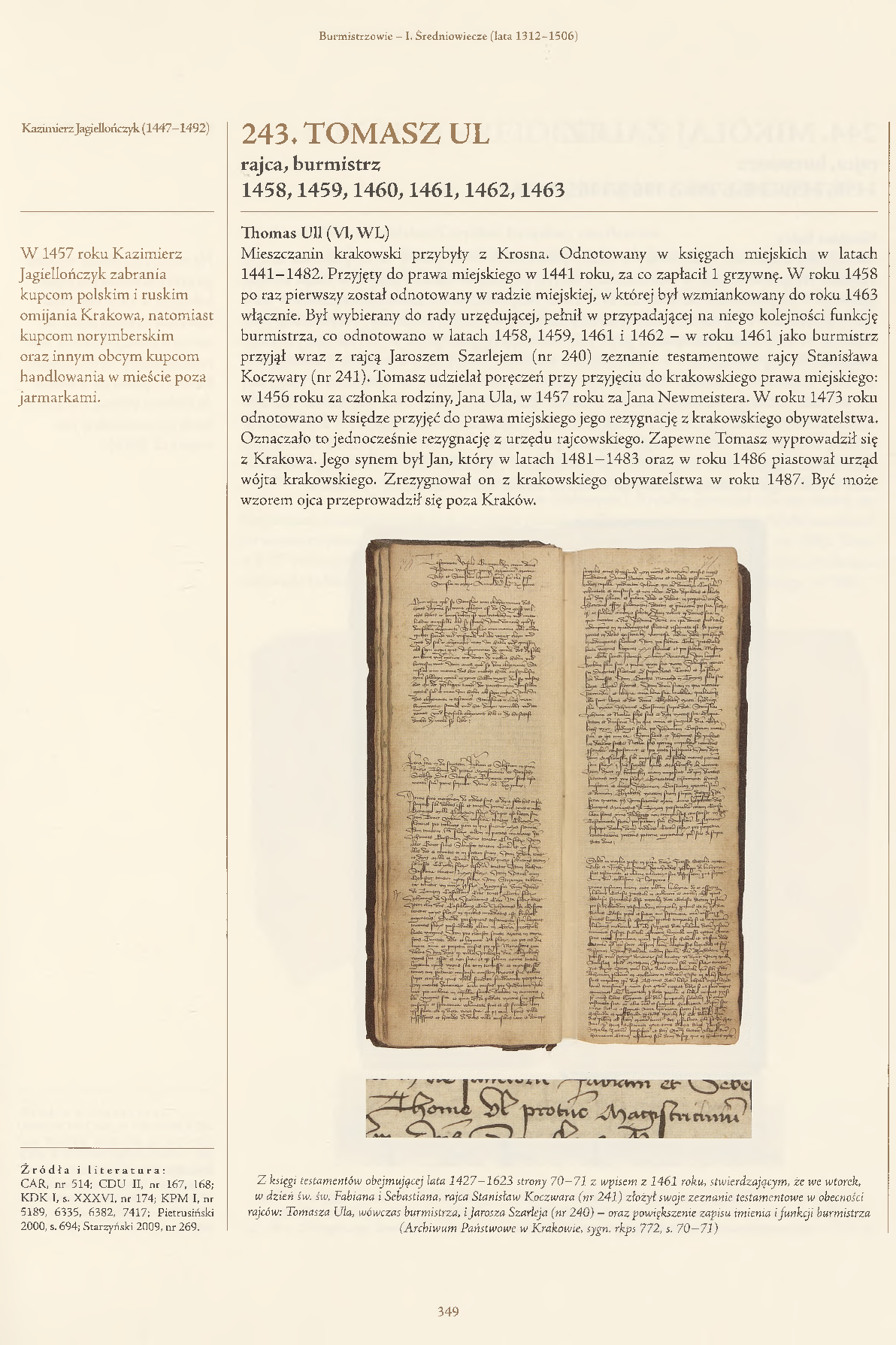 Z księgi testamentów obejmującej lata 1427−1623 strony 70−71 z wpisem z 1461 roku, stwierdzającym, że we wtorek, w dzień św. św. Fabiana i Sebastiana, rajca Stanisław Koczwara (nr 241) złożył swoje zeznanie testamentowe w obecności rajców: Tomasza Ula, wówczas burmistrza, i Jarosza Szarleja (nr 240) – oraz powiększenie zapisu imienia i funkcji burmistrza (Archiwum Państwowe w Krakowie, sygn. rkps 772, s. 70−71)