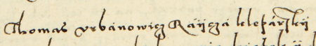 Z kleparskiej księgi radzieckiej obejmującej sprawy z lat 1569–1578: wpis dotyczący sporu, w którym Tomasz Urbankowicz występuje jako opiekun małoletnich dzieci i majątku zmarłego Marcina Waliszewskiego – oraz zbliżenie zapisu imienia i urzędu (Archiwum Narodowe w Krakowie, sygn. KL 28, s. 419)