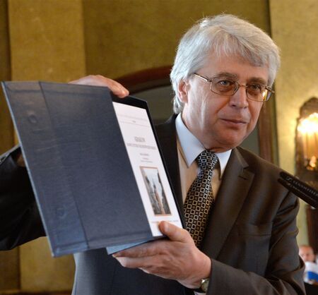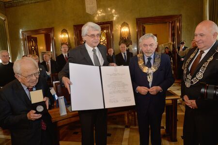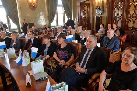 Uczestnicy wydarzenia oraz w asyście prezydenta miasta i przewodniczącego RMK prezentacja medalu przez byłego, wieloletniego prezesa Towarzystwa prof. Jerzego Wyrozumskiego i dyplomu przez jego następcę, obecnego prezesa TMHiZK.