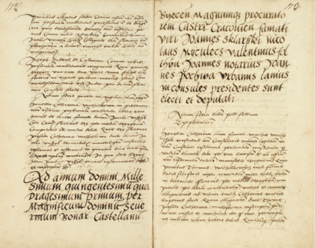 Z księgi radzieckiej Kleparza obejmującej lata 1539–1546: wpis z 1541 roku dokumentujący wybór rady urzędującej, z rajcą-burmistrzem Urbanem rzeźnikiem w składzie – oraz zbliżenie zapisu imienia (Archiwum Narodowe w Krakowie, sygn. KL 24, s. 112–113)