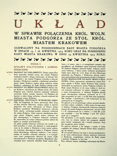 | 7 czerwca 1913 | Na podstawie powyższych uchwał uroczyste podpisanie przez przedstawicieli obu miast dokumentu Układ w sprawie połączenia Królewskiego Wolnego Miasta Podgórza ze Stołecznym Królewskim Miastem Krakowem. |