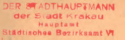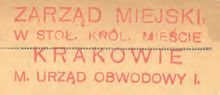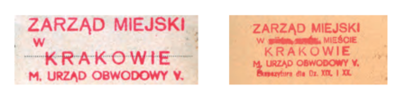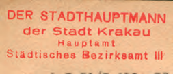 Z początkiem okupacji stosowano dotychczasowe pieczęcie, dostosowane do nowej nazwy miasta Krakowa poprzez usunięcie skrótów przymiotników „stołeczne, królewskie”. Przykłady: