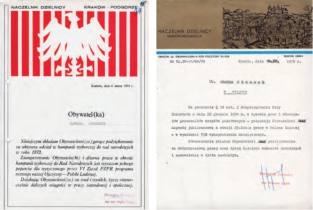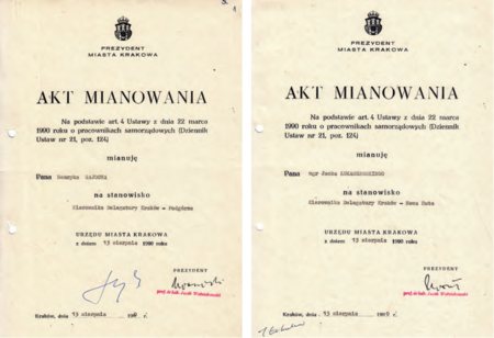 Dokument dokonanego w 1979 r. przez prezydenta miasta Krakowa aktu nominacji na stanowisko naczelnika Dzielnicy Nowa Huta (z akt Urzędu Miasta Krakowa) W latach 70. i 80 XX w. starano się szarą rzeczywistość przedstawiać w ubarwionej formie – ozdobne papiery firmowe naczelników dzielnic: z roku 1974 – naczelnika Dzielnicy Kraków Podgórze, z roku 1976 – naczelnika Dzielnicy Kraków Śródmieście, z roku 1986 – naczelnika Dzielnicy Kraków Krowodrza oraz z roku 1987 – naczelnika Dzielnicy Kraków Podgórze (Archiwum Zakładowe Urzędu Miasta Krakowa, sygn. spis 2661/53; spis 77/153; spis 3767/6 oraz ze zbiorów prywatnych) W sierpniu 1990 r. przeprowadzono stabilizację personalną kierownictwa delegatur Urzędu Miasta Krakowa – komplet dokonanych przez prezydenta miasta Jacka Woźniakowskiego aktów mianowania kierowników 4 delegatur oraz dyrektora Biura Delegatur i jego zastępcy, którzy łączyli te stanowiska z kierowaniem przydzielonymi delegaturami (ze zbiorów prywatnych oraz z akt Urzędu Miasta Krakowa)