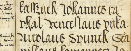 Z księgi radzieckiej Kazimierza obejmującej lata 1481–1508: fragment wpisu dokumentującego wybór rady urzędującej na rok 1498, z Wacławem Wiką w składzie – oraz zbliżenie zapisu imienia (Archiwum Narodowe w Krakowie, sygn. K 7, s. 333)