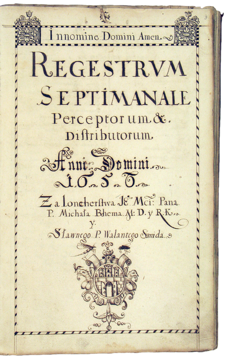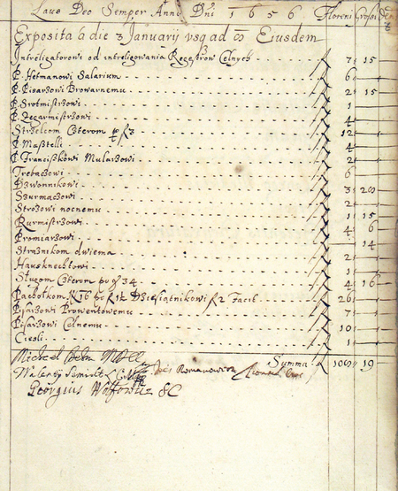 Z księgi miejskiej rachunkowej obejmującej rok 1656 strony tytułowa i 7 z okresowym zestawieniem bieżących wydatków miasta w 1656 roku, gdy funkcję lonerów pełnili Michał Behm (nr 510) i Walenty Smidt – oraz powiększenie złożonego pod tym zestawieniem podpisu Smidta, kontrolującego stan rachunków (Archiwum Państwowe w Krakowie, sygn. rkps 2057, s. 1, 7)