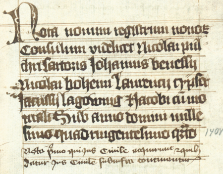 Z księgi radzieckiej Kazimierza obejmującej lata 1402–1416: fragment wpisu dokumentującego wybór rajców na rok 1404, z Wawrzyńcem Czipserem w składzie – oraz zbliżenie zapisu imienia (Biblioteka Jagiellońska, sygn. rkps 1045/1, k. 66)