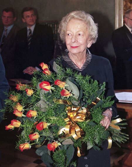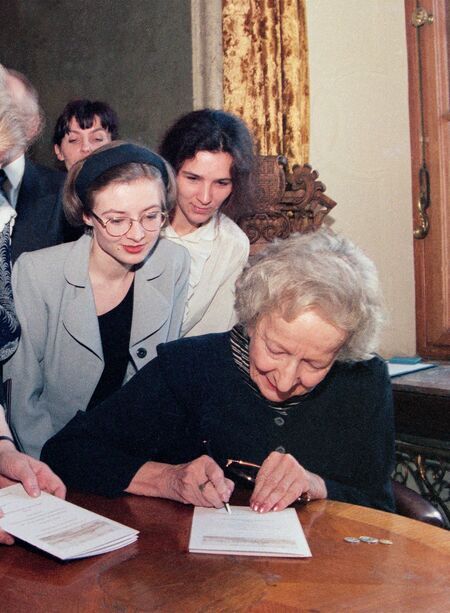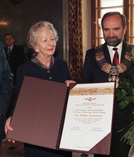 Z uroczystości wręczenia dyplomu honorowego obywatelstwa 11 marca 1998 r. w Pałacu Wielopolskich. Wisława Szymborska w sali Obrad RMK oraz własnoręczny podpis uhonorowanej.