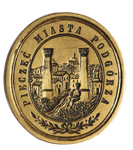 Oryginalne podgórskie urzędowe tłoki pieczętne miasta i magistratu (widok w lustrzanym odbiciu) – pierwszy, z napisem w otoku: STADTKASSA DER K. FREYSTADT PODGORZE – KASA MIEJSKA KRÓLEWSKIEGO WOLNEGO MIASTA PODGÓRZA, używany był w okresie przedautonomicznym, pozostałe trzy, z legendą w języku polskim, obowiązywały po roku 1867. Nie zachowały się tłoki pieczętne z napisami w języku łacińskim – por. odciski na kolejnej ilustracji (Archiwum Narodowe w Krakowie, sygn. T 184, T 192, T 180, T 294)