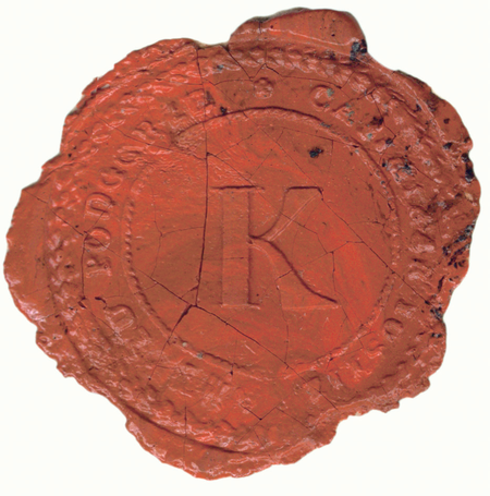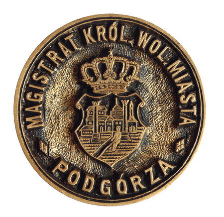 Odciski w laku dwóch najstarszych z zachowanych pieczęci związanych z Podgórzem: z lewej strony odcisk pieczęci sądu kazimierskiego dla Podgórza, pochodzący z 1787 roku; pieczęć ta używana była już wiele lat wcześniej w sprawach dotyczących tamtejszej ludności podległej jurysdykcji Kazimierza z tytułu zamieszkiwania na obszarze stanowiącym własność tego miasta, używano jej do sprzedaży przez Kazimierz tych terenów Austriakom, to jest do 1788 roku. Z prawej strony pochodzący z 1783 roku odcisk pieczęci policyjno-sądowej Podgórza, używanej w okresie organizacji miasta, co najmniej do 1785 roku. W otoku napis: PODGORZER POLICEY GERICHTS SIEGEL (Archiwum Narodowe w Krakowie, sygn. P 1 s. 1, 157)