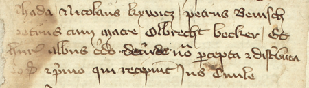 Z księgi radzieckiej Kazimierza obejmującej lata 1385–1386: fragment wpisu dokumentującego wybór rajców na rok 1386, z Wojciechem (Albertem) Bockerem w składzie – oraz zbliżenie zapisu imienia (Archiwum Narodowe w Krakowie, sygn. K 2, s. 81)
