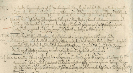Z Kroniki Golińskiego fragment kalendarium, w którym pod rokiem 1648 odnotowano zgon rajcy Wojciecha Mroczkowicza; notka poprzedzająca informuje o śmierci duchownego z Wolbromia, który czary z ludzi wyganiał y na czary pomagał, natomiast notka następna dotyczy wyboru do rady autora Kroniki, Marcina Golińskiego (Biblioteka Zakładu Narodowego im. Ossolińskich, sygn. rkps 188)