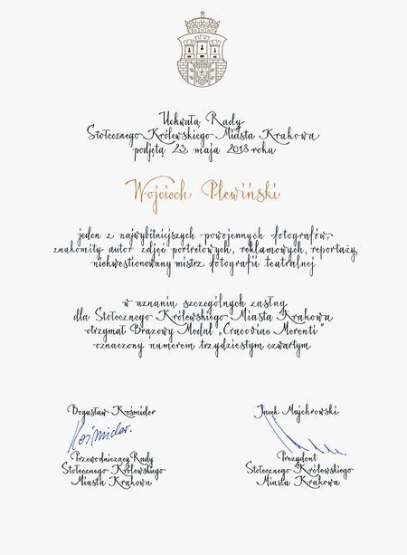 …w uznaniu szczególnych zasług dla Stołecznego Królewskiego Miasta Krakowa… (z uchwały Rady Miasta Krakowa nr CII/2641/18) |