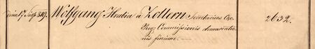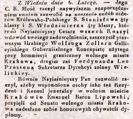 fragment notatki z „Gazety Lwowskiej” z 1820 r., nr 23, dotyczącej przyzwolenia cesarza Austrii na przyjęcie przez Wolfganga von Zollerna zagranicznych zaszczytów: Orderu św. Stanisława przyznanego przez cesarza Rosji i honorowego obywatelstwa Krakowa nadanego przez Senat Wolnego Miasta Krakowa.