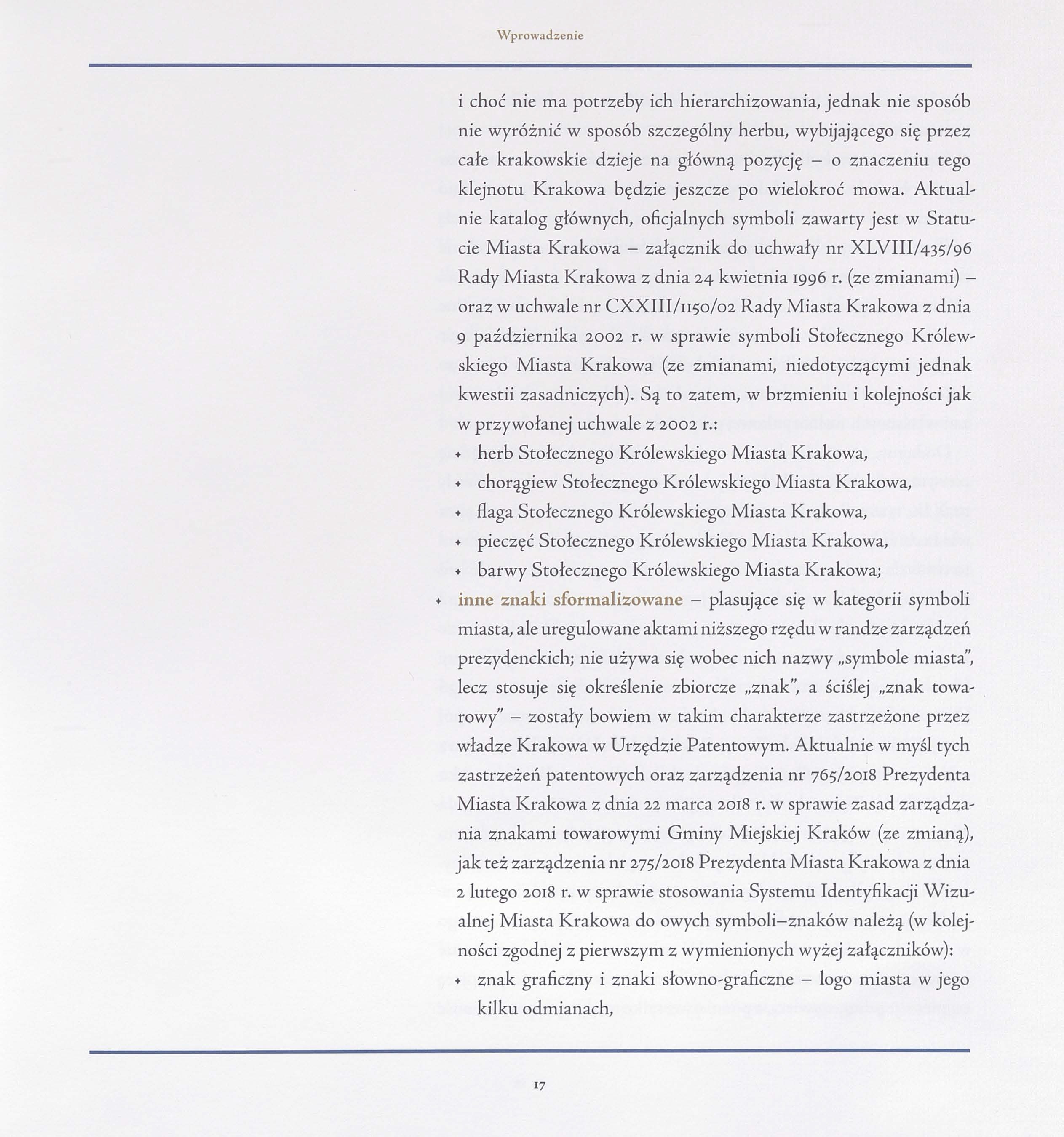 Dodajmy, że w odrodzonym w 1990 r. krakowskim samorządzie pierwsza regulacja symboli oficjalnych nastąpiła w drodze uchwały nr XIX/132/91 Rady Miasta Krakowa z dnia 15 marca 1991 r. w sprawie herbu i barw Stołecznego Królewskiego Miasta Krakowa, która to uchwała – jak wskazuje już sam jej tytuł – ograniczała się do uregulowania dwóch symboli miasta: jego godła i barw. Przełom nastąpił w roku 2002, gdy Rada Miasta Krakowa przyjęła uchwałę – wcześniej już tu przywołaną – propozycje specjalnie powołanej Komisji Heraldycznej. W istotnym zakresie nową koncepcję oraz szczegółowe projekty głównej symboliki Krakowa opracował wówczas zespół specjalistów: prof. dr hab. Zenon Piech i dr hab. Wojciech Drelicharz z Uniwersytetu Jagiellońskiego oraz dr hab. Barbara Widłak z Akademii Sztuk Pięknych. Wynik tej pracy, ubrany już w szatę regulacji normatywnej, ustabilizował ów system i zagwarantował naszemu miastu ujęcie jego symboliki w sposób kompleksowy i jednoznaczny.