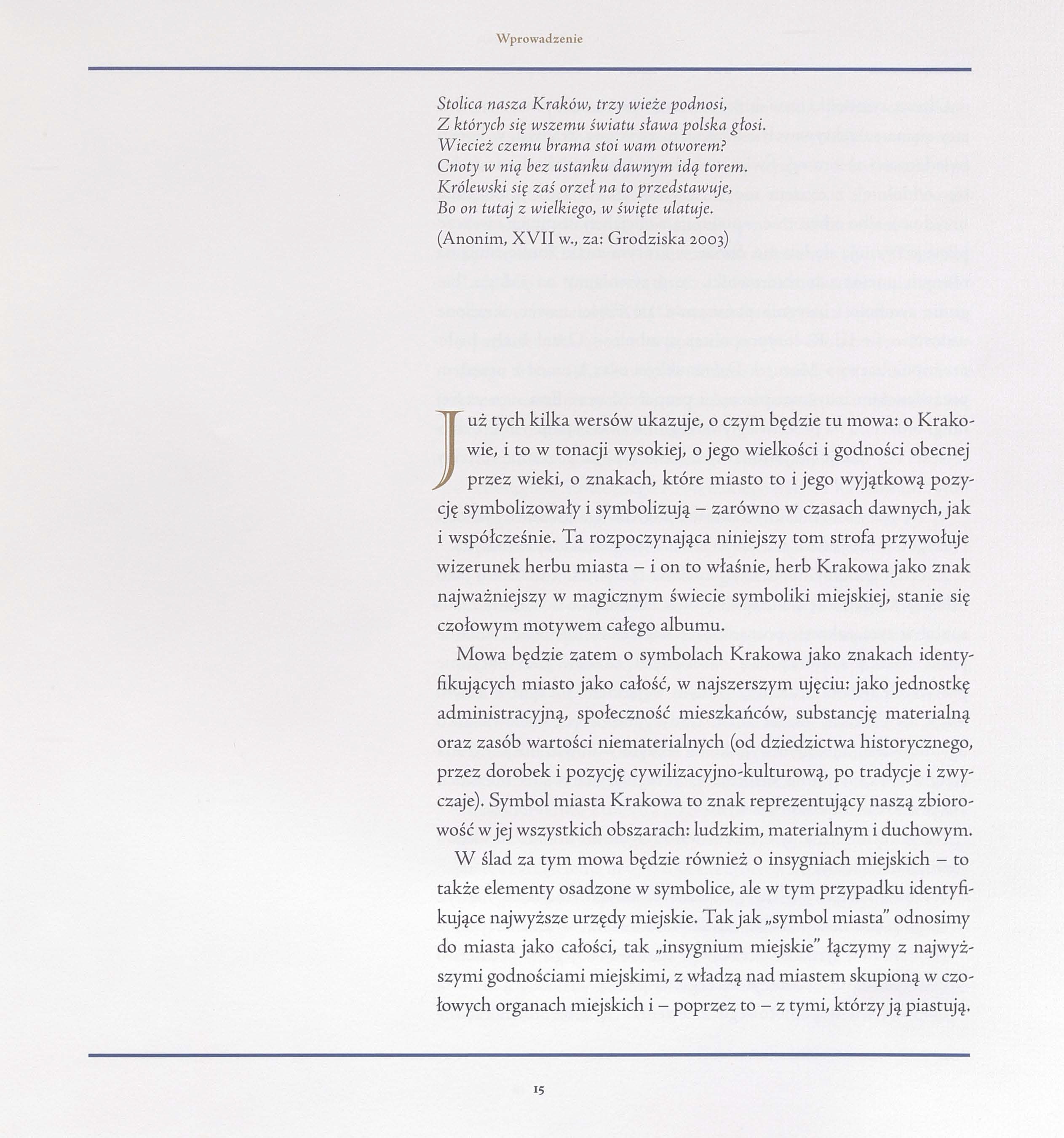 Już tych kilka wersów ukazuje, o czym będzie tu mowa: o Krakowie, i to w tonacji wysokiej, o jego wielkości i godności obecnej przez wieki, o znakach, które miasto to i jego wyjątkową pozycję symbolizowały i symbolizują – zarówno w czasach dawnych, jak i współcześnie. Ta rozpoczynająca niniejszy tom strofa przywołuje wizerunek herbu miasta – i on to właśnie, herb Krakowa jako znak najważniejszy w magicznym świecie symboliki miejskiej, stanie się czołowym motywem całego albumu.