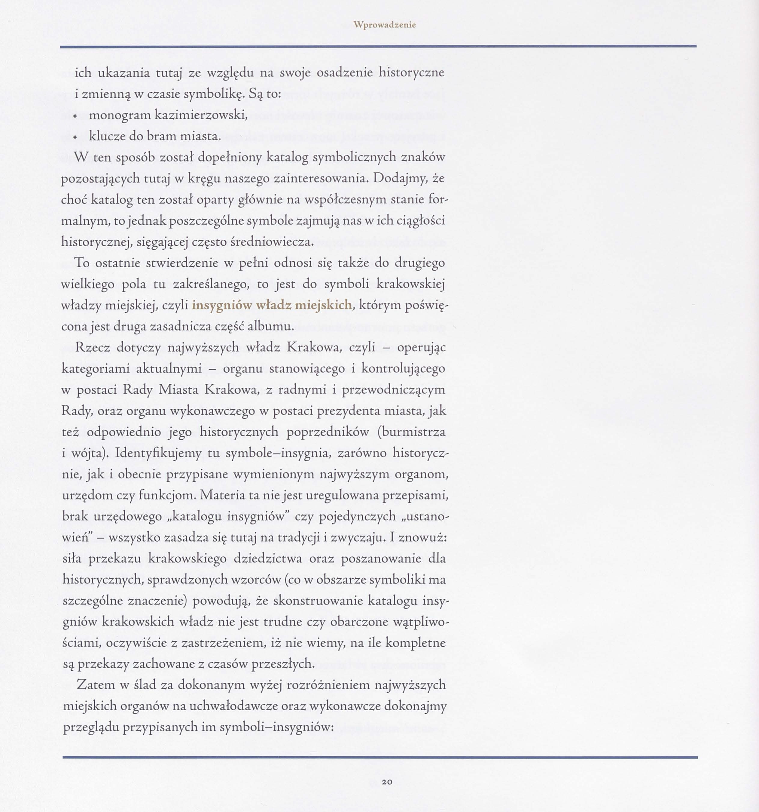 To ostatnie stwierdzenie w pełni odnosi się także do drugiego wielkiego pola tu zakreślanego, to jest do symboli krakowskiej władzy miejskiej, czyli insygniów władz miejskich, którym poświęcona jest druga zasadnicza część albumu.