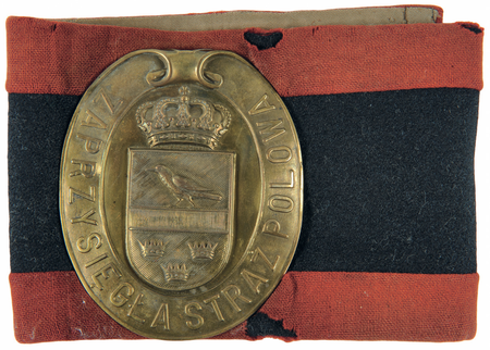 Opaska na ramię z odznaką zaprzysięgłej straży polowej gminy Płaszów, datowana na drugą połowę XIX wieku (w centrum herb Galicji Zachodniej – czarna kawka nawiązująca do herbu ziemi halickiej i trzy korony utożsamiane z herbem biskupstwa krakowskiego), oraz odznaka straży polowej gminy Krowodrza, datowana na koniec XIX wieku (Muzeum Historyczne Miasta Krakowa, nr inw. 396/III, 397/III)