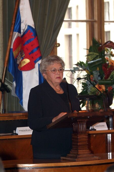 Uroczystości wręczenia medalu z dyplomem 3 października 2007 r. w Pałacu Wielopolskich: wystąpienie laureatki z mównicy prezydialnej RMK oraz reprodukcja dyplomu; ujęcie z sali Obrad.